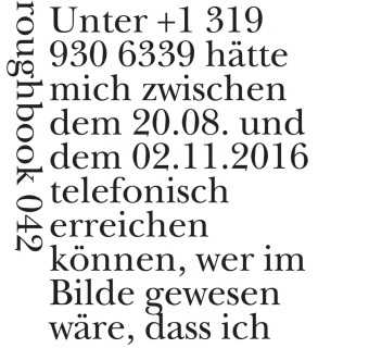 "Unter +1 319 930 6339 hätte mich", schreibt Mara Genschel zur Entstehung ihres roughbooks, "zwischen dem 20.08. und dem 02.11.2016 telefonisch erreichen können, wer im Bilde gewesen wäre, dass ich das Angebot angenommen hatte, für diesen Zeitraum in der 430 North Clinton Street, Iowa City, IA...