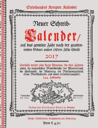 Steinhausers Kempter Kalender ist nachweislich der älteste Volkskalender Deutschlands und befindet sich seit 1773 in Familienbesitz. Das Innenleben des 96 Seiten umfassenden Kalenders ist mit einer Palette an Informationen, wie den Wochen- und Namenstagen, Horoskop-Zeichen, einem...