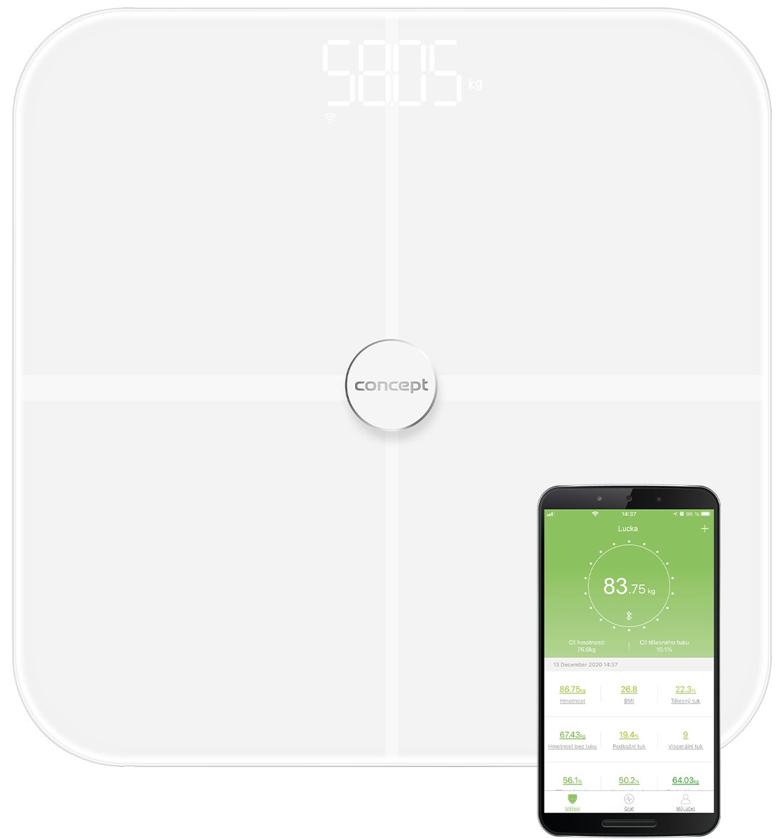 S chytrou osobní váhou Concept VO4010 Perfect Health budete mít své zdraví pod kontrolou. Kromě tělesné hmotnosti dokáže analyzovat dalších 12 parametrů vč. tělesného tuku, svalové hmoty nebo metabolického věku. Dosahuje nosnosti 180 kg s minimální měřitelnou hodnotou 0,2 kg.