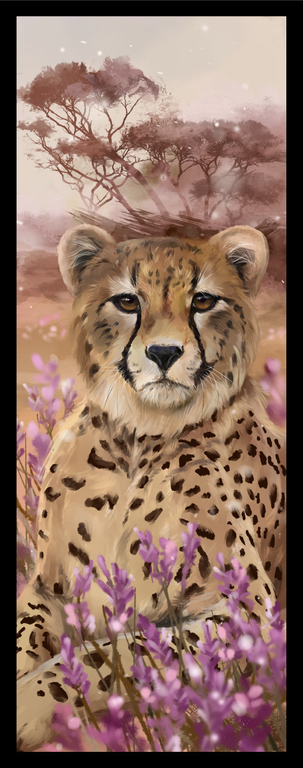 Málokterá šelma loví s takovou grácií jako divoké kočky - proto jsme jim věnovali celou sérii záložek. Na této záložce vás okouzlí gepard, představovaný jako seriózní a pohotový lovec s bystrým zrakem a vzorovaným kožichem. Přestože je to silný a elegantní predátor, má i jemnější stránku - malinově fialové květy v savaně představují jeho oblíbené útočiště. Taková kombinace síly a jemnosti dělá tuto záložku výjimečnou a přináší radost každému, kdo ji používá.