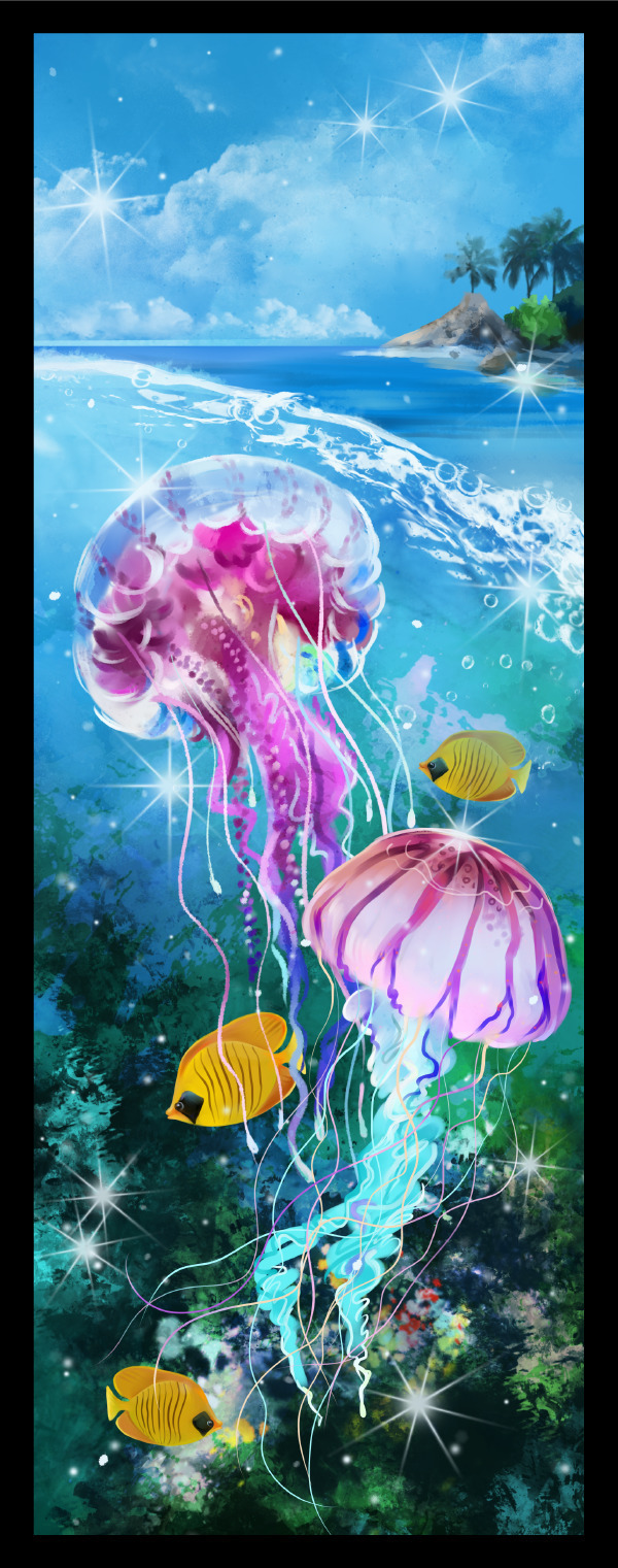 Vůně soli a barevný svět pod hladinou - to je série sběratelských záložek Oceán. Ponořte se do ní až po uši. Medúza se tentokrát nechala odnést skoro až ke břehu. Vlny se opřely do jejího fialového kloboučku a zavezly ji do tropického ráje: palmy, písek, útesy. Slunce praží z oblohy a vzhlíží se na hladině. Medúzy jsou po celém moři proslulé jako žahavé parádnice, kloboučky a pentle a závojíčky, vše sladěné do růžovofialova. A natřásají se jedna báseň, až z toho jde všem rybám hlava kolem.