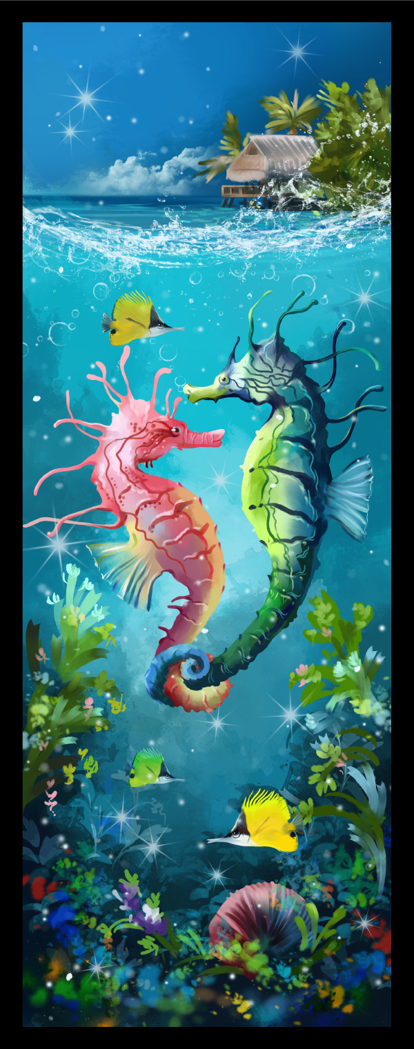Barevný svět pod hladinou a tropický ráj na pobřeží - to jsou sběratelské záložky ze série Oceán. Zamiluje se i suchomilec. A zamiloval se i mořský koník, když v chaluhách narazil na tuhle překrásnou růžovou slečnu. Pod hladinou teď probíhá prvotřídní namlouvání, ocasy se proplétají, jako by v širém oceánu nebylo jiné šupinaté duše. Barevné rybky proplouvají kolem a chudinky nevědí, kam se koukat. Tohle místo je pro líbánky přímo ideální - nakonec nad hladinou jen o kus dál stojí dřevěný přístřešek s terasou oblíbeného prázdninového letoviska.