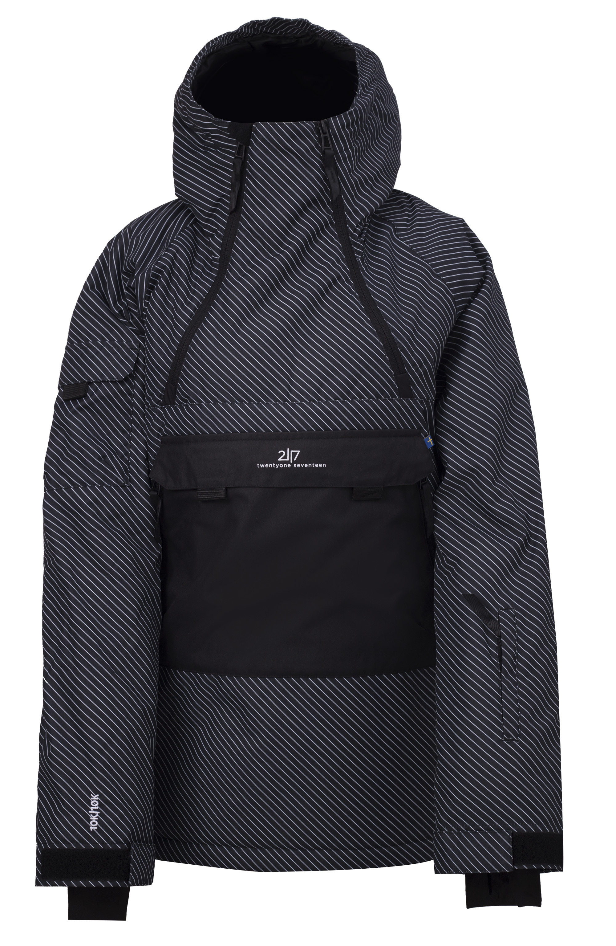 Matná oxfordská látka Velká klokaní kapsa Dvě boční kapsy Kapsa na horním rukávu Kapsa na skipas dole na levém rukávu Stahování v bocích Elastická manžeta na konci rukávů Neodnímatelný protisněhový pás