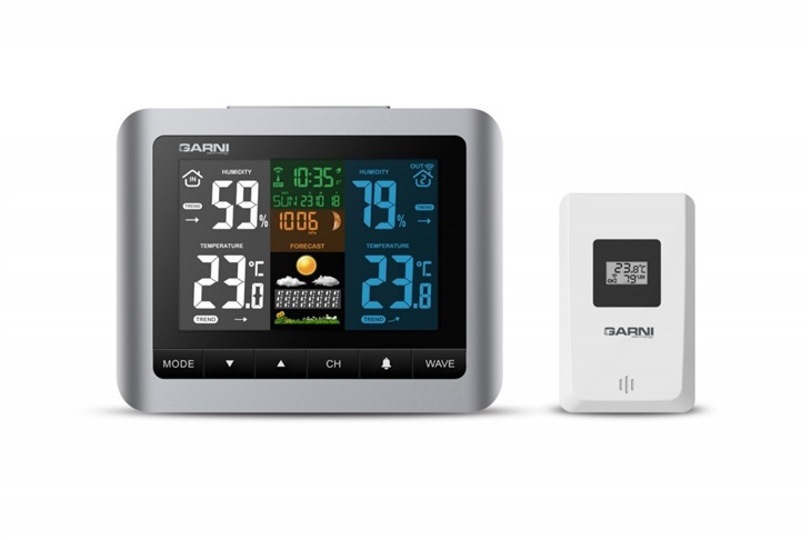 Meteorologická stanice s inverzním barevným displejem s časem a datem řízenými rádiovým signálem DCF-77, budíkem, měřením vnitřní teploty, relativní vlhkosti a absolutního barometrického tlaku, bezdrátovým čidlem pro měření vnější teploty a relativní vlhkosti.