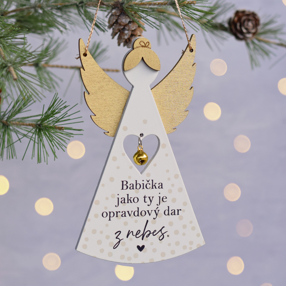 Malý dárek pro velkou radost. Andělka na zavěšení tónovaná do zlatých odstínů s rolničkou a krásným českým textem.velikost: 15 x 9 cm