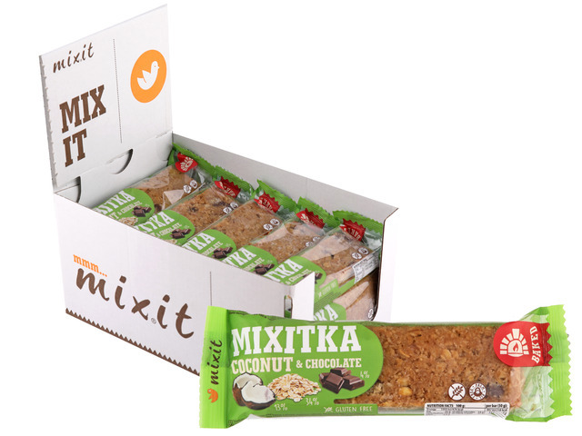 Nová receptura s větší porcí čokolády! Voňavá kokosová Mixitka se vrátila do nabídky ještě více čokoládová a stále stejně vypečená a bez lepku. Radost ze zakousnutí do čokoládových peciček tak nově čeká v každém soustu. :-)1 ks = 40 g