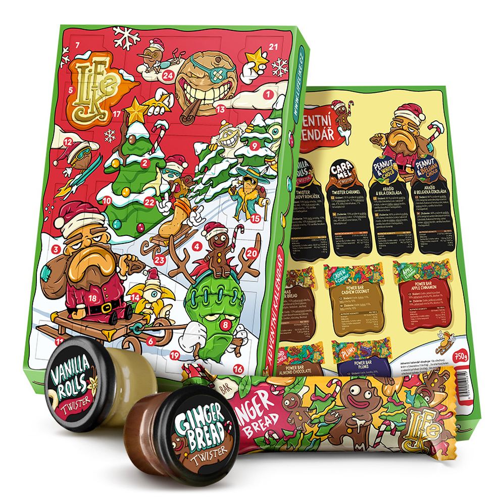 Představujeme vám Adventní kalendář plný dobrot. Uvnitř balení naleznete exkluzivní limitované krémy (kombinace arašídů a čokolády). Ale můžete se těšit i na stálice jako je Caramel twister a oblíbené vánoční limitky: Vanilkový rohlíček a Perníček. V neposlední řadě obsahuje Power bar ořechové tyčinky (a to různé druhy). Takže si opravdu každý pochutná!