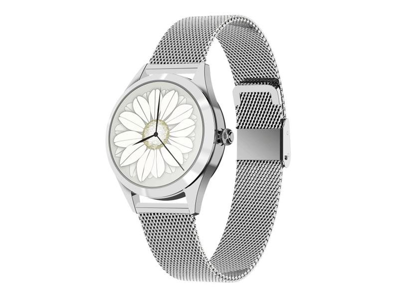 Dámské chytré hodinky, kovové zpracování, dotykový kulatý displej, výběr z množství ciferníků, nastavení vlastní fotografie na ciferník, funkce pro ženy (monitorování menstruačního cyklu), orientační měření tepu, tlaku, sportovní a další funkce, notifikace, kompatibilita Android a iOS