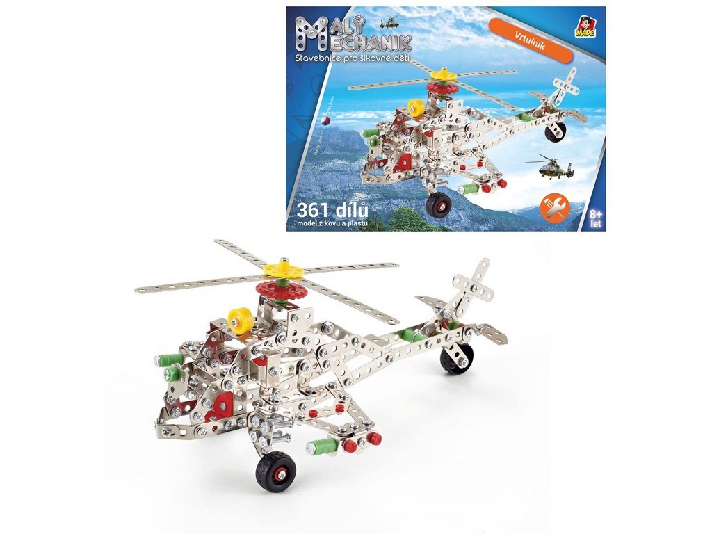 Malý mechanik - vrtulník. Dětská stavebnice Malý mechanik obsahuje kovové díly a plastové doplňky, spojuje se pomocí šroubků a matiček. 361 dílků. Stavebnice jsou ideální volbou pro všechny děti, rozvíjí logické myšlení, jemnou motoriku, soustředěnost a učí trpělivosti a přitom jsou skvělou zábavou. Český box v grafickém designu řady Malý mechanik.Rozměr: 21 x 27 x 13 cmDoporučený věk: 6 +