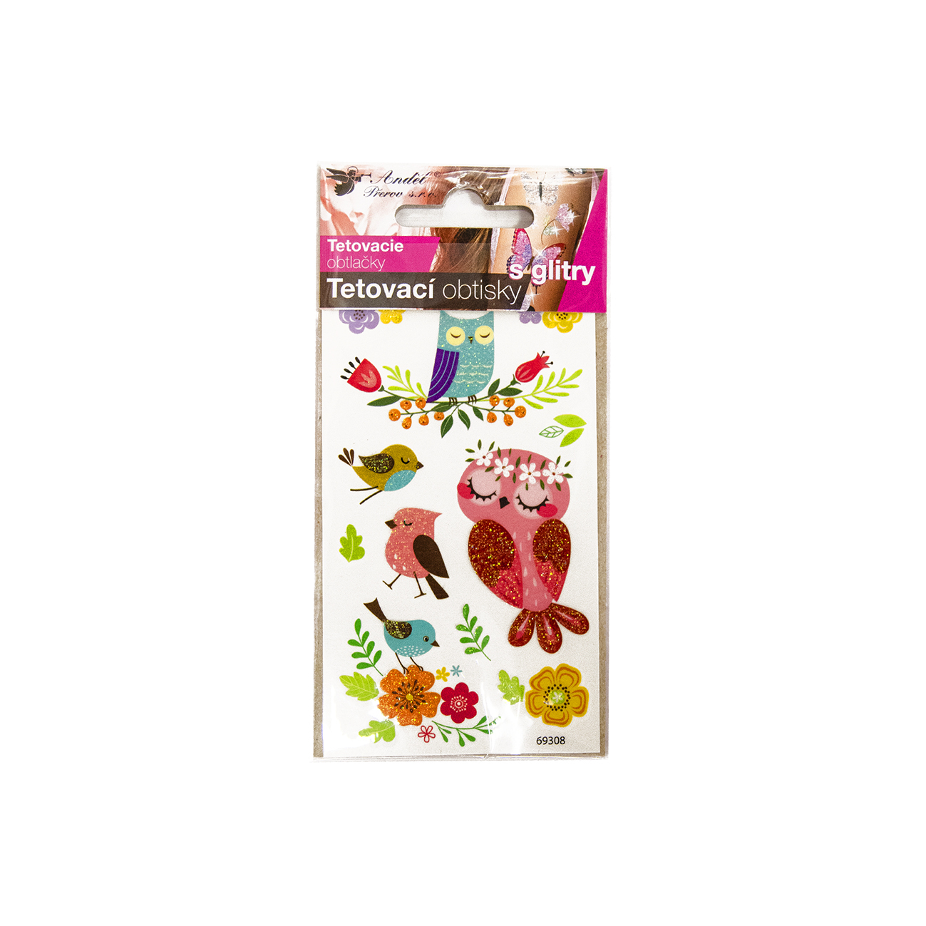 Tetovací obtisk sovy s glitry 6x11 cm