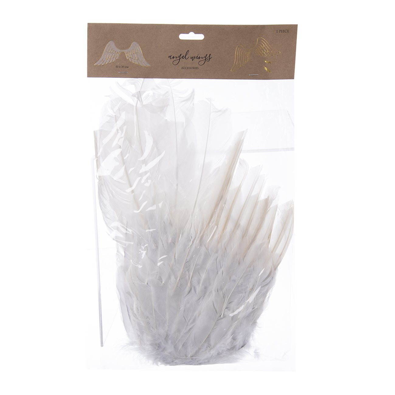Andělská křídla jsou vyrobena z bílého prachového peří, čistě bílá, bez třpytek a netřepí se, vypadají tedy velmi reálně. Jednoduše se křídla nasadí na ramena pomocí přišité gumy. Mají střední rozměry a hodí se jak pro děti od 7 let, tak pro dospělé. Rozměry: 53 x 37 cm. Pro dokonalý vzhled doporučujeme nakoupit i svatozář a tím dotáhnout andělský kostým k dokonalosti.