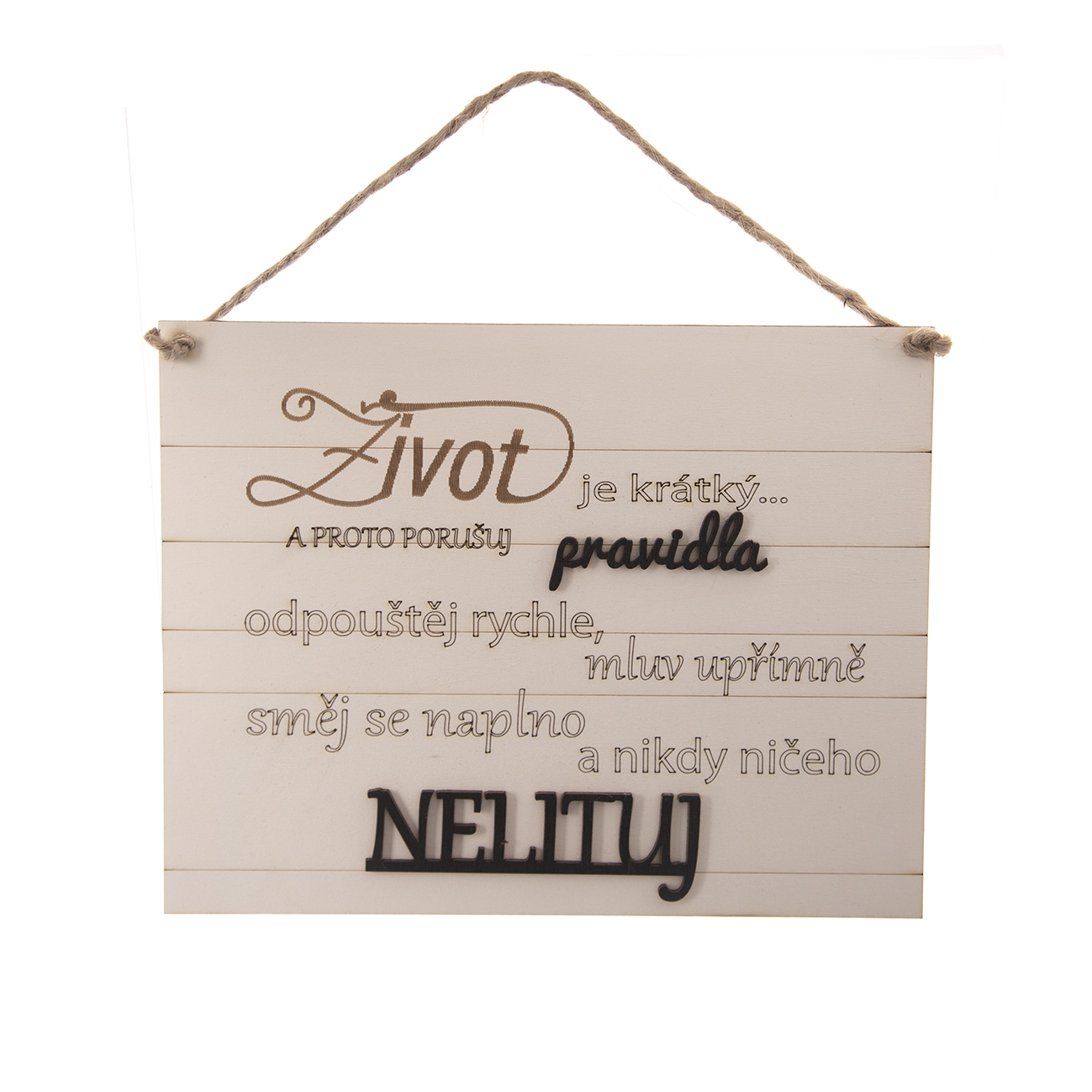 Oživte svůj domov jedinečnou dekorací, která vás bude neustále inspirovat! Cedule s mottem "Život je krátký..." vám připomene, jak důležité je užívat si každý okamžik naplno.