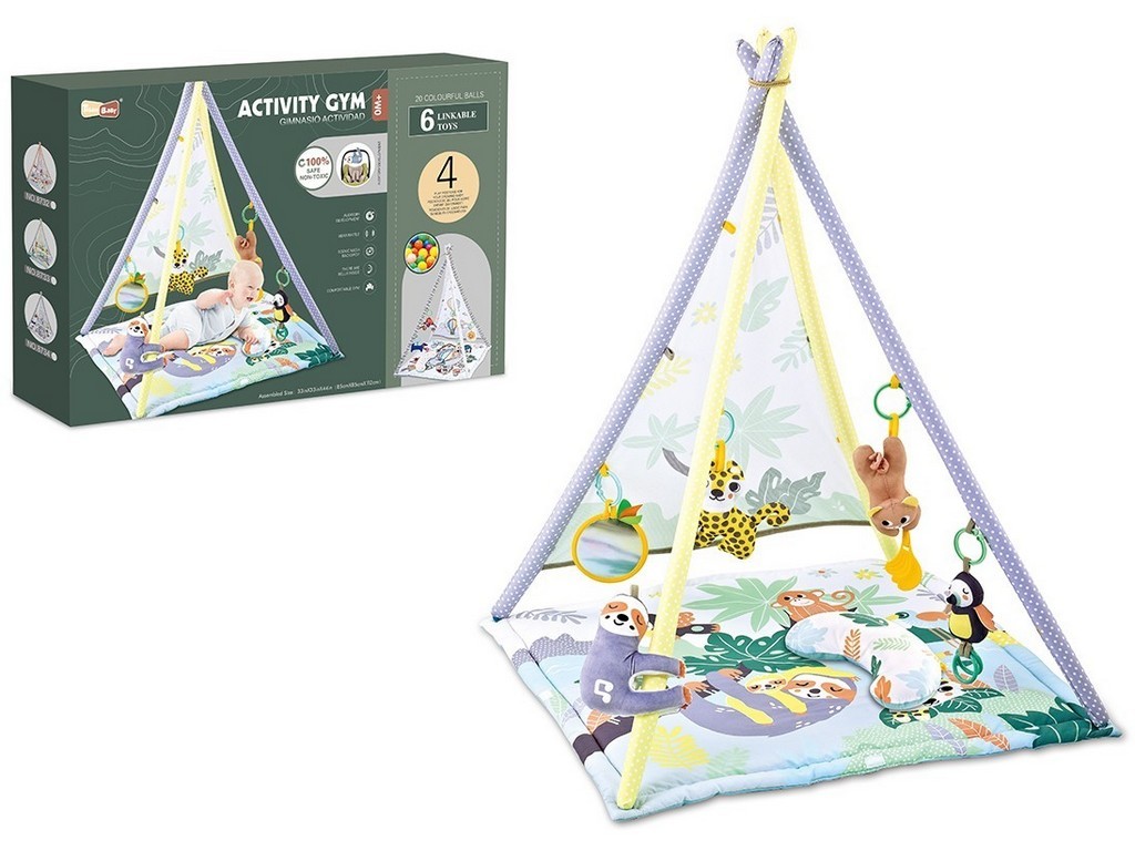 Podložka se stanem v kontrastních barvách.Deka je nejoblíbenějším a praktickým dárkem pro nejmenší děti.Deka s kontrastními barvami velmi snadno zaujme je jak zábavnou pomůckou tak naučnou.Deka nabízí rozmanité možnosti aktivit, hudbu a různé doplňky.Hračky jsou přichyceny klipem. Klipem hračky snadno přichytíte i na jiné potřebné místo - kočárek, postýlku nebo autosedačku.Samotný klip je kousátkem. Klipy slouží k trénování úchopu.Půlměsícový polštář podpoří znavené miminko v poloze na bříšku.Rozměr: 85 x 85 x 112 cmNapájení: 2 x 1,5V (AAA) baterie nejsou součástí balení.Doporučený věk: 0 +