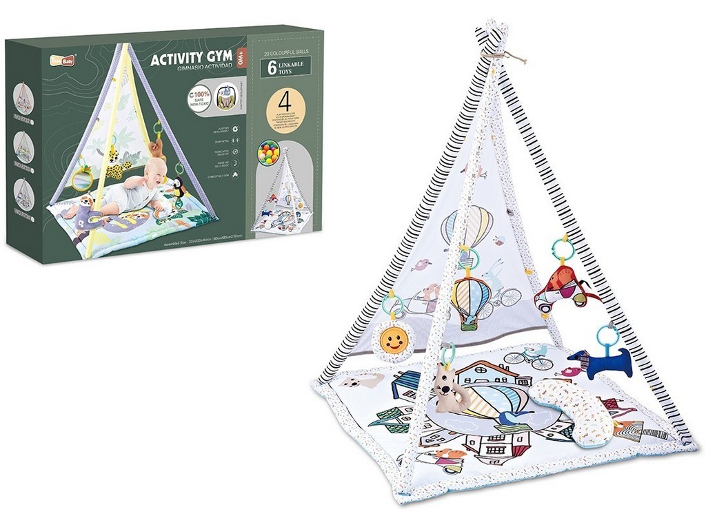 Podložka se stanem v kontrastních barvách.Deka je nejoblíbenějším a praktickým dárkem pro nejmenší děti.Deka s kontrastními barvami velmi snadno zaujme je jak zábavnou pomůckou tak naučnou.Deka nabízí rozmanité možnosti aktivit, hudbu a různé doplňky.Hračky jsou přichyceny klipem. Klipem hračky snadno přichytíte i na jiné potřebné místo - kočárek, postýlku nebo autosedačku.Samotný klip je kousátkem. Klipy slouží k trénování úchopu.Půlměsícový polštář podpoří znavené miminko v poloze na bříšku.Rozměr: 85 x 85 x 112 cmNapájení: 2 x 1,5V (AAA) baterie nejsou součástí balení.Doporučený věk: 0 +