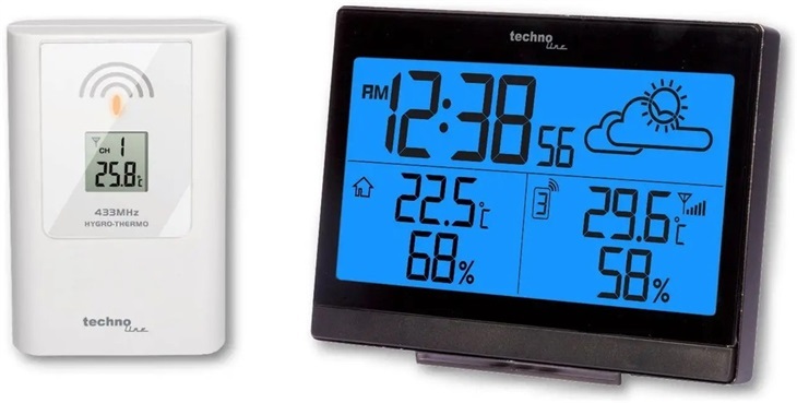 Metorologická stanice Technoline; velikost displeje hlavní jednotky 64 x 124 mm; velikost číslic - čas 25 mm, teplota a relativní vlhkost 14 mm
