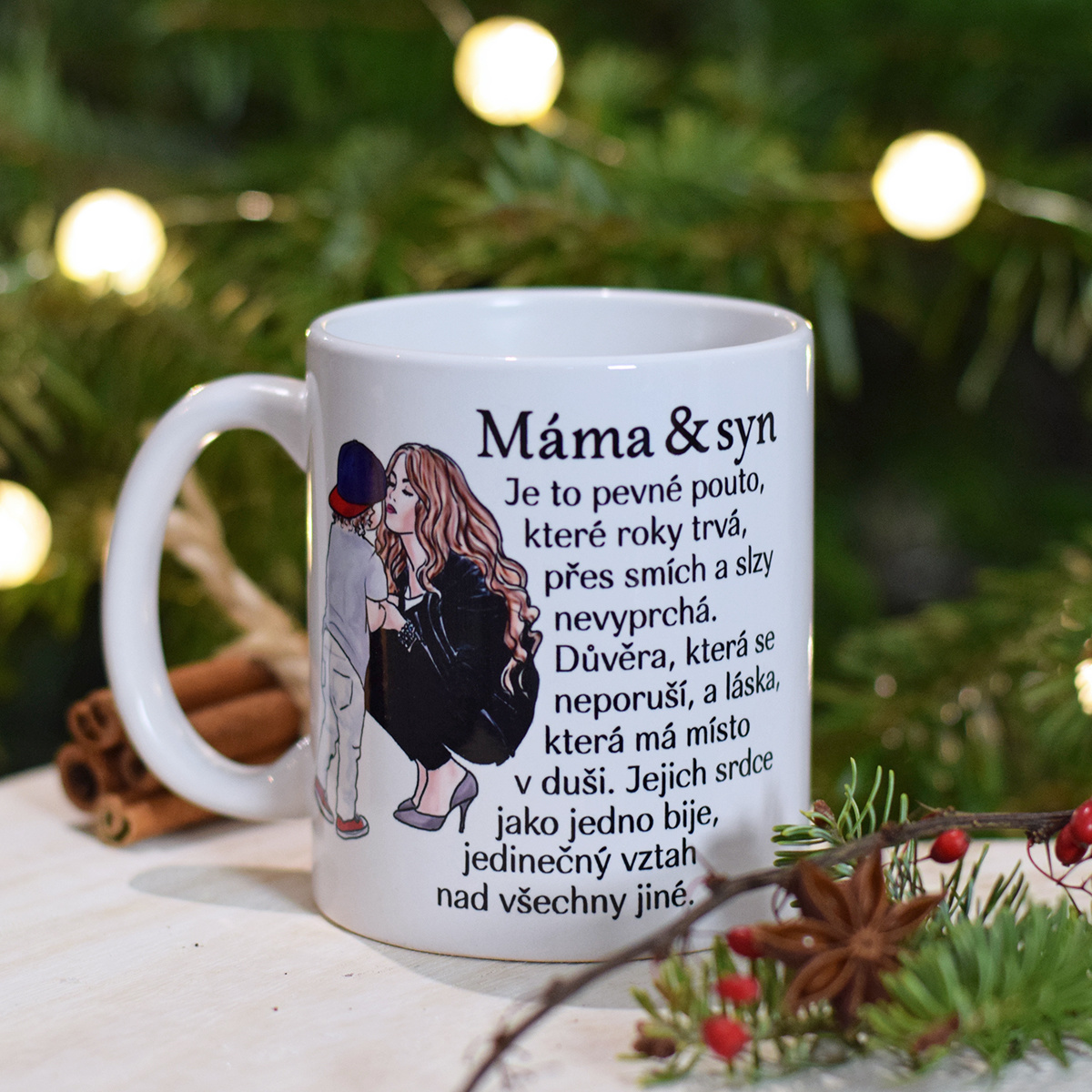 Hrnek - Máma a syn - obrázek Hrnek s ruční malbou matky a syna a s krásným citátem přímo od srdce. Potěšte maminku originálním dárkem.objem: 330 ml