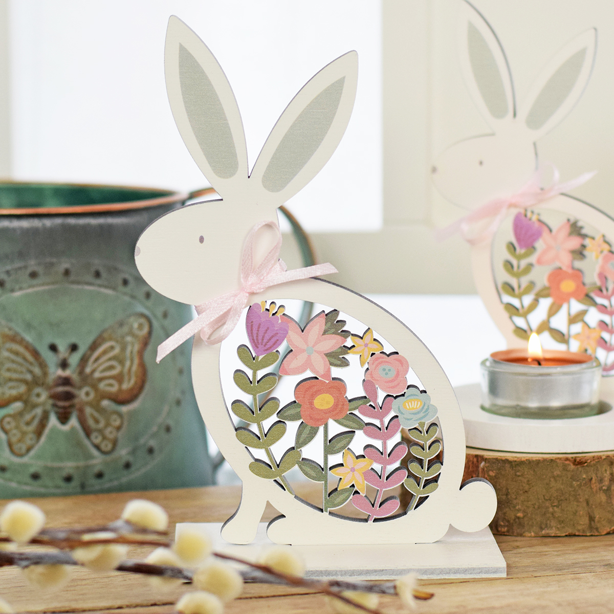 Rozromilý zajíček na postavení může být veselým oživením Vašeho domova. velikost: 18,5 x 12,5 cm.