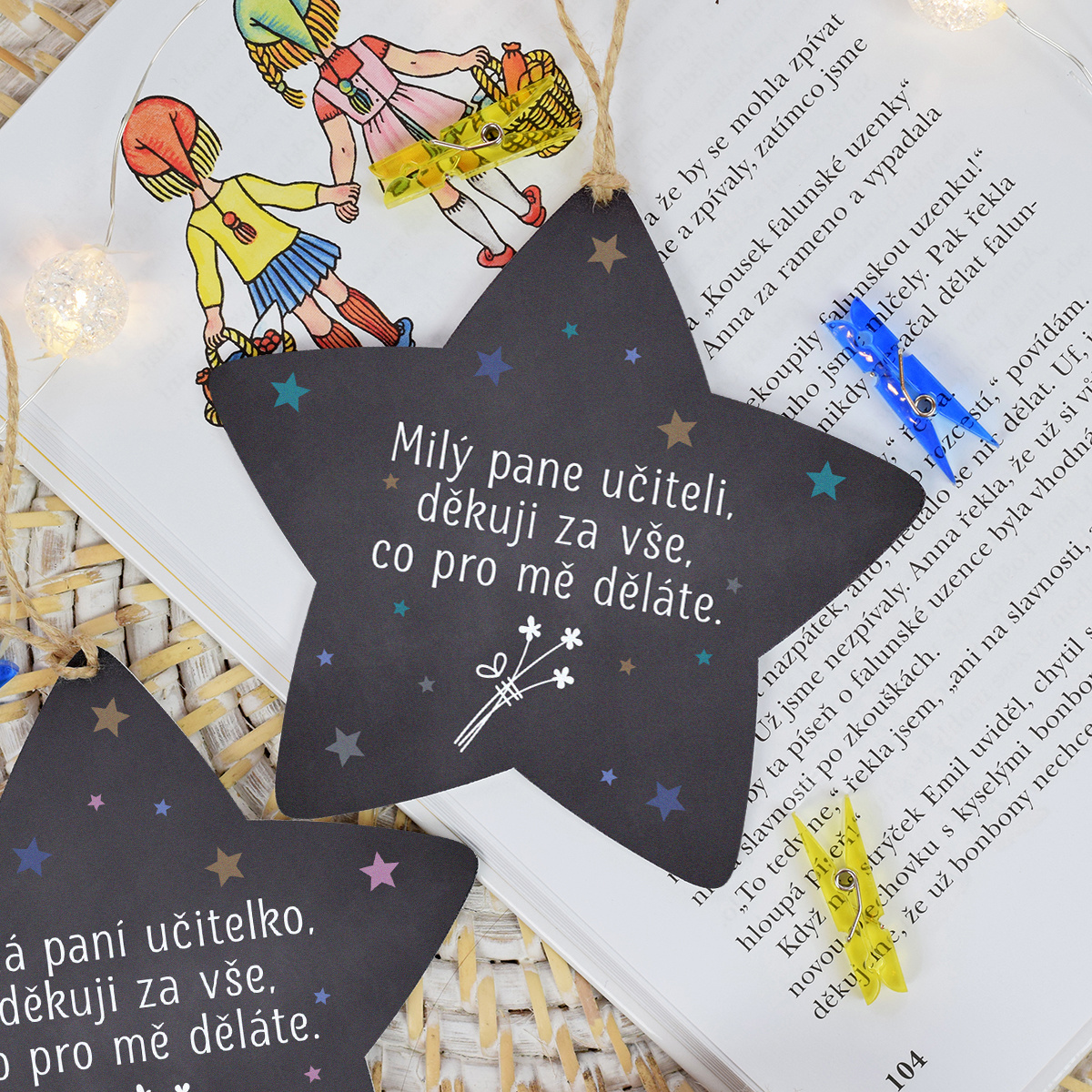 Dřevěná hvězdička s citátem jako poděkování panu učiteli za jeho snahu a péči.