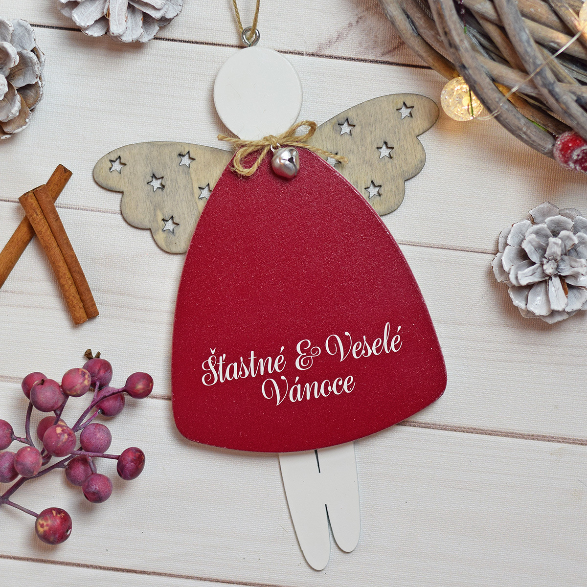 Anděl s hvězdami - Šťastné & VeseléAndílek s hvězdami s vánočním přáním. Krásné zpracování s detaily jako je rolnička nebo přírodní provázek.Velikost: 23 x 14,5 cmmateriál: dřevo