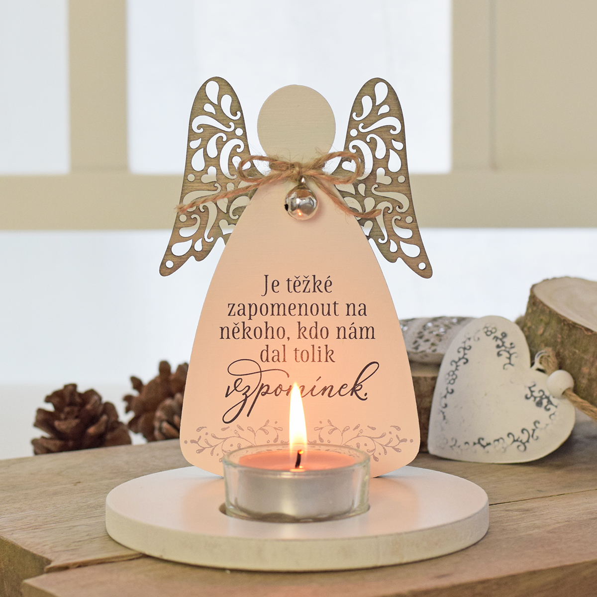 Dřevěný svícen ve tvaru anděla s krásným citátem. Pro někoho je anděl symbolem štěstí, ochrany, lásky nebo může být vzpomínkovým symbolem na ty, kteří už tu nemohou být s námi.Cena včetně skleněného svícnu na čajovou svíčku.velikost: 14,5 x 12,5 cm číst celé