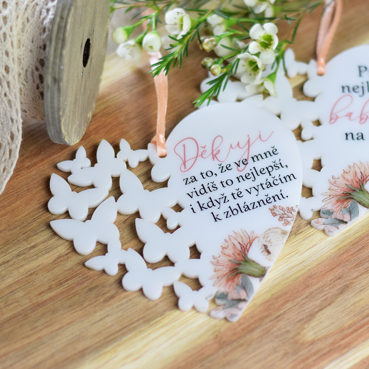Toto srdíčko s motýlky a milým citátem je vhodné jako dárek třeba pro partnerky, maminky nebo babičky.