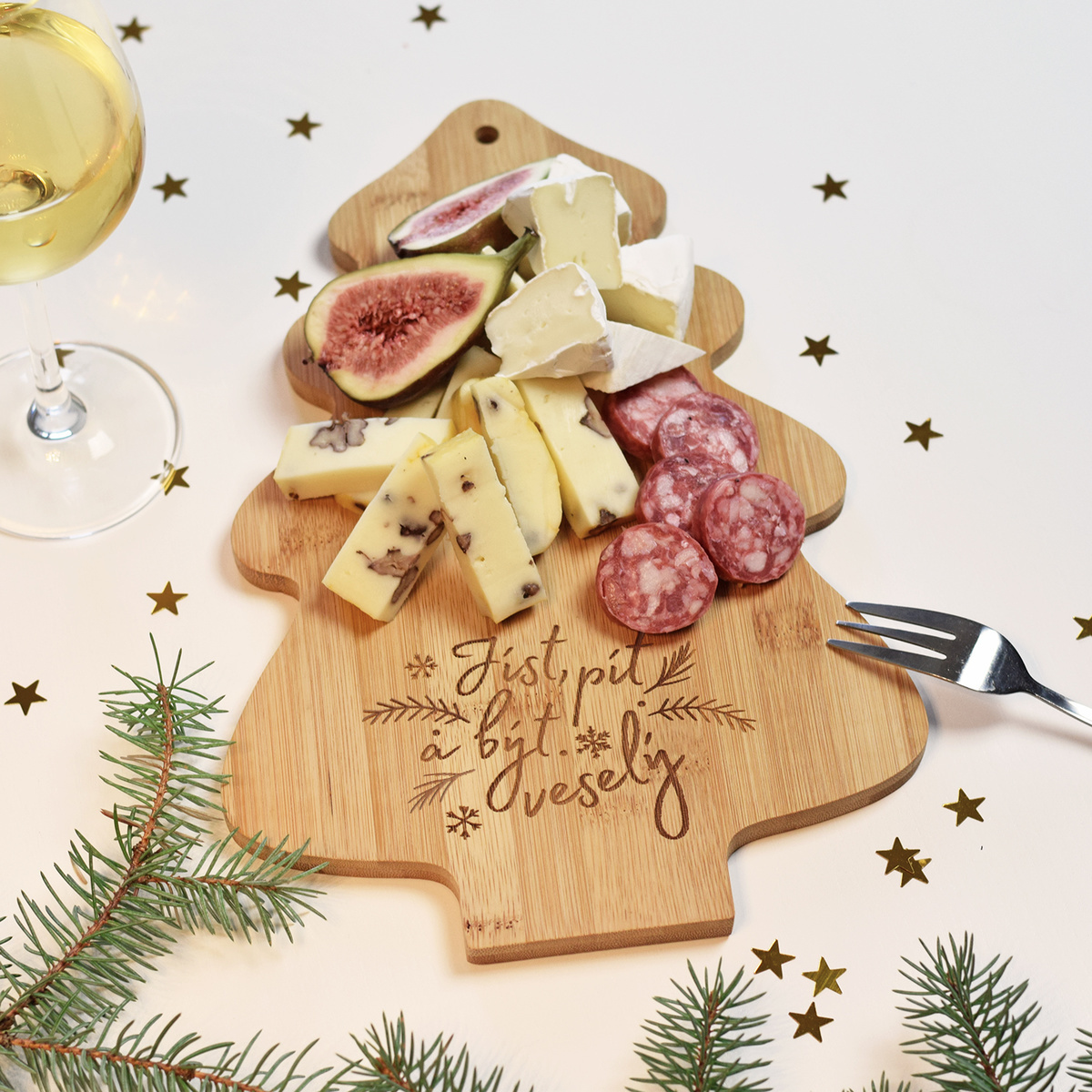 Servírovací prkénko "Jíst, pít a být veselý."Toužíte si užívat volný večer s přáteli nebo se svým milým? Naservírujte dobré jídlo na toto originální bambusové prkénko. Prkénko jsme dekorovali hezkým vánočním nápisem. Vychutnejte si volné chvíle, bavte se a relaxujte!velikost prkénka: 30 x 20 cm