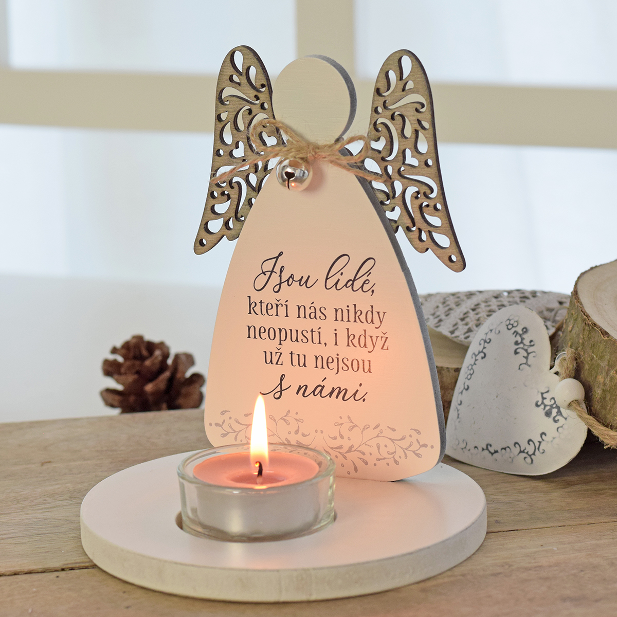 Dřevěný svícen ve tvaru anděla s krásným citátem. Pro někoho je anděl symbolem štěstí, ochrany, lásky nebo může být vzpomínkovým symbolem na ty, kteří už tu nemohou být s námi.Cena včetně skleněného svícnu na čajovou svíčku.velikost: 14,5 x 12,5 cm