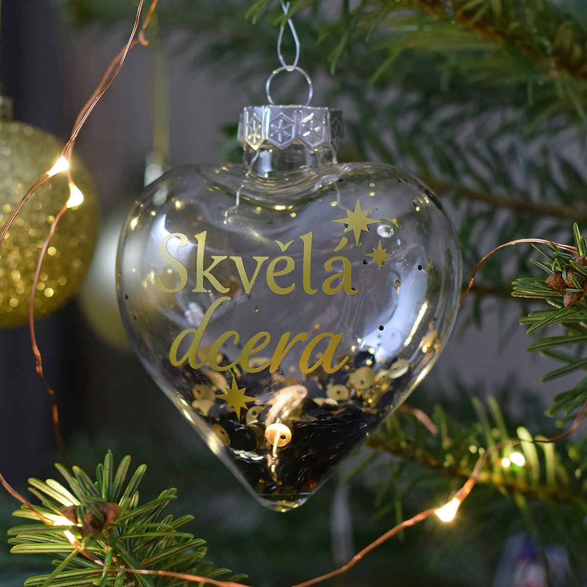 Vánoční baňka se zlatým nápisem pro dceru. Tato ozdoba je doplněná zlatými glitry, které se budou třpytit na vánočním stromečku.velikost: 11 x 9 cm