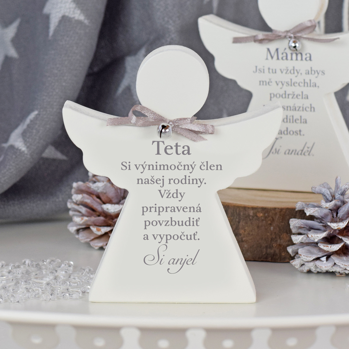 Andílci z této kolekce mohou být úžasným dárkem pro Vaše blízké. Jsou vyrábění opravdu s pečlivostí a jemně dekorovaní s mašlí a rolničkou. Bezpochyby potěšíte darovanou osobu, protože andílci obsahují opravdu upřímné a krásné citáty.velikost: 12 x 10 cmmateriál: dřevo