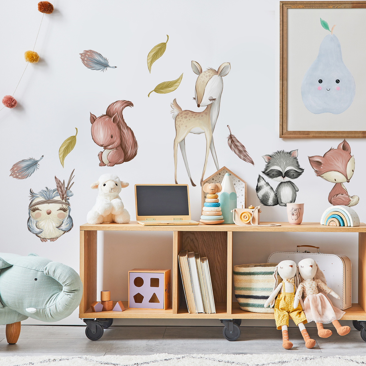 Dětská samolepka s motivy oblíbených lesních zvířátek. Tato moderní dekorace oživí stěny dětských pokojíčků!