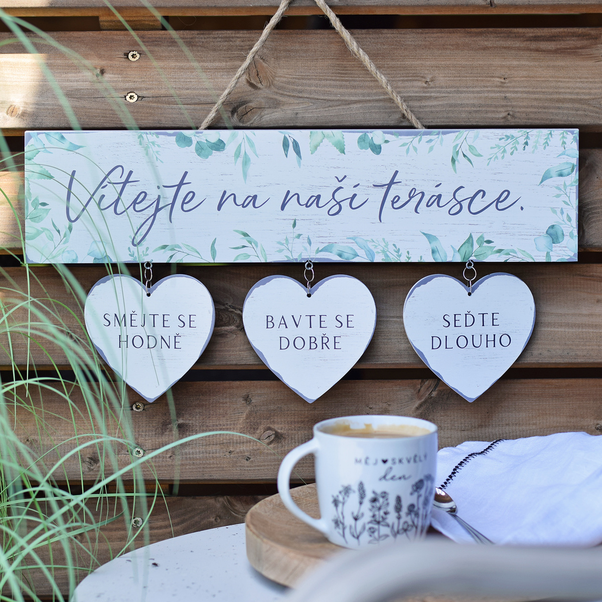 Zahradní cedule se srdíčky - Vítejte na naší terásce.