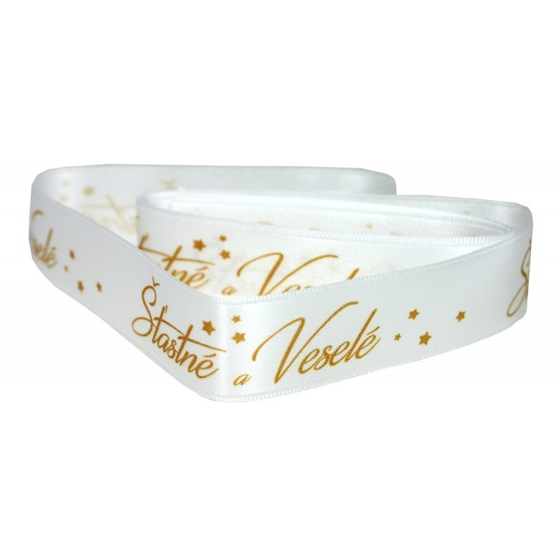 Látková stuha s nápisem Šťastné a veselé, délka 2 m.Barva - bílo- krémová číst celé
