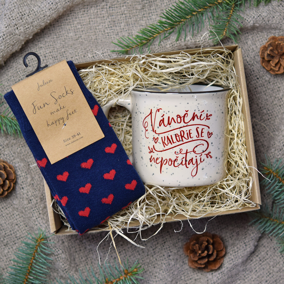 Hledáte perfektní tip na dárek? Určitě je to tato dárková krabička, ve které najdete originální hrníček s vtipným nápisem a příjemné ponožky s motivem srdíček.