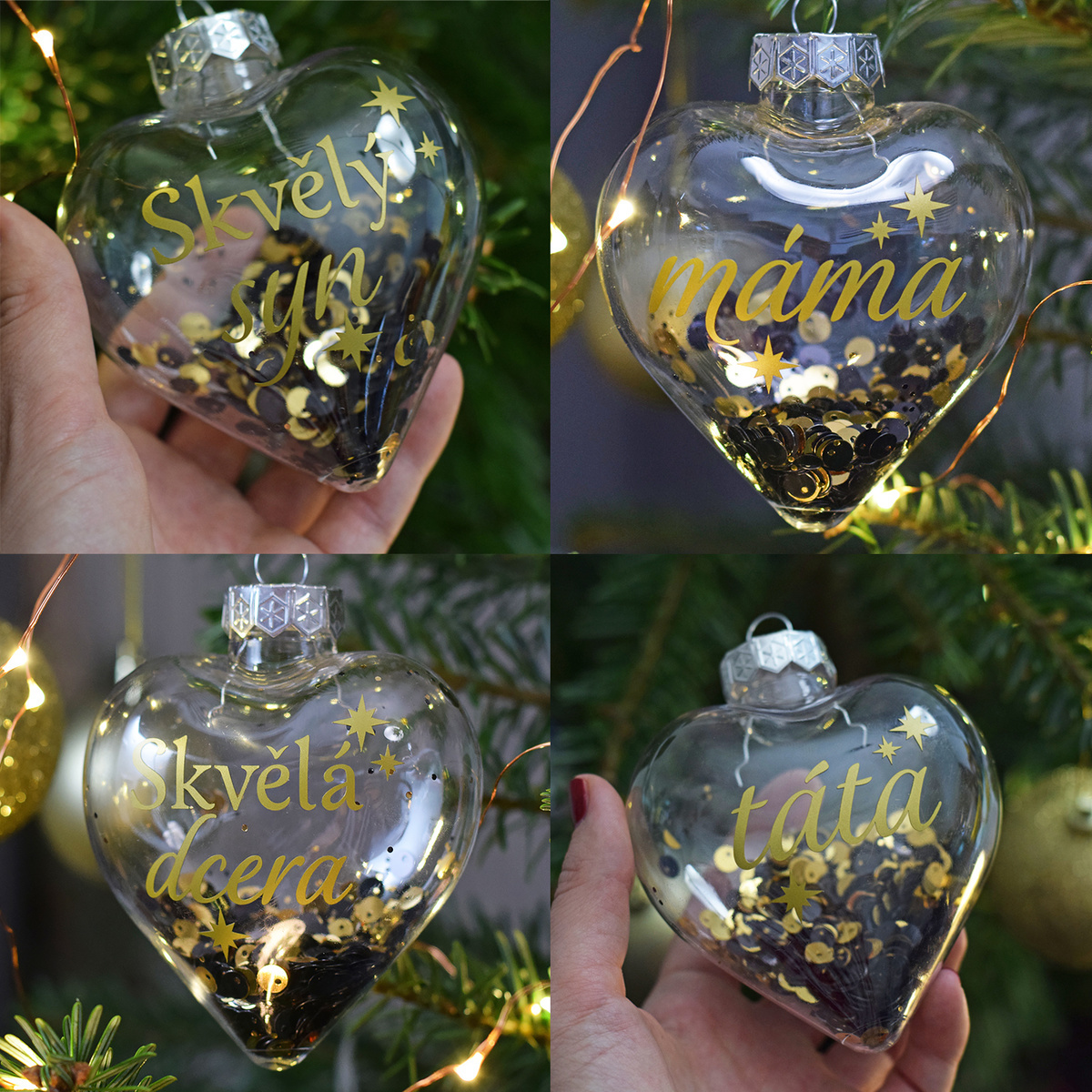 Vánoční baňky se zlatým nápisem všech členů rodiny. Tato ozdoba je doplněná zlatými glitry, které se budou třpytit na vánočním stromečku.velikost: 11 x 9 cm4 kusy v balení číst celé