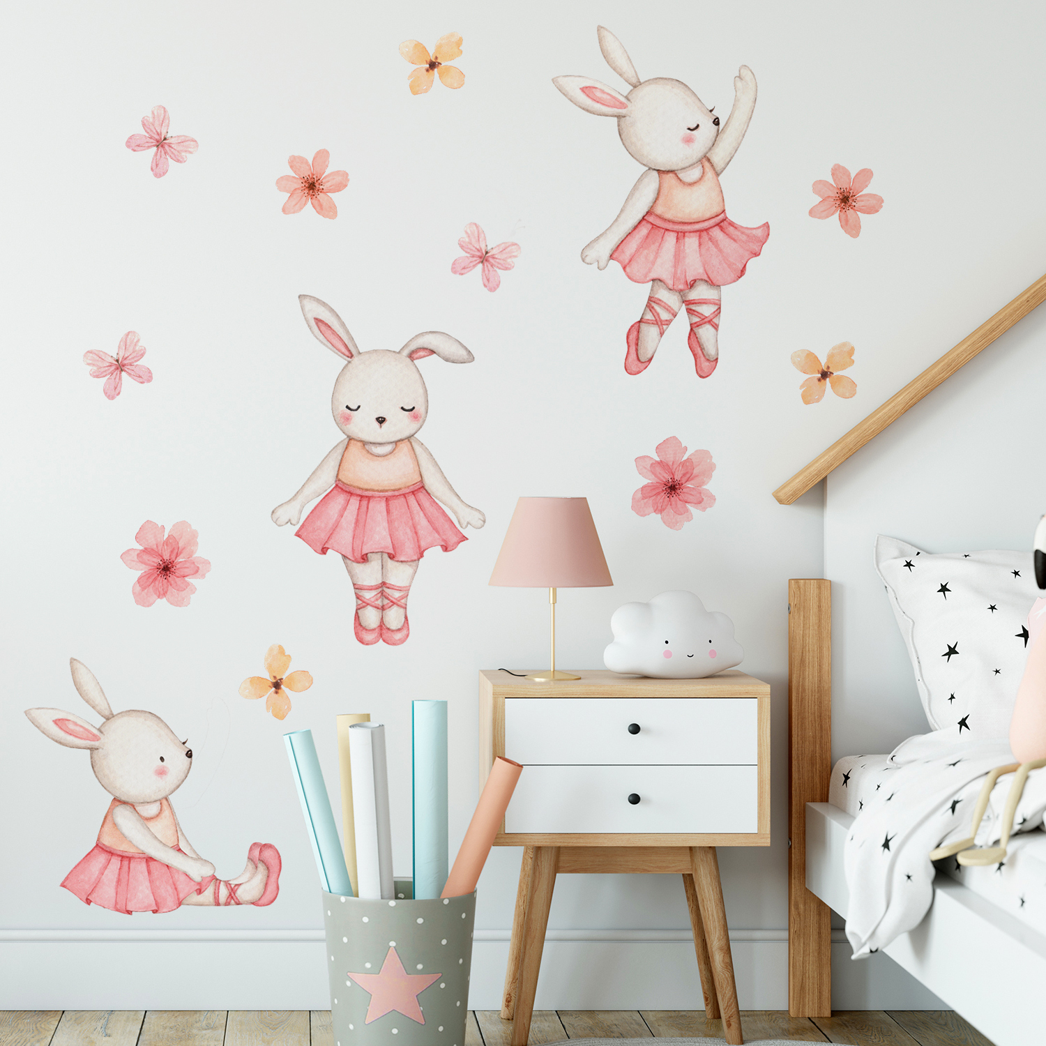 Pro malé milovnice baletu jsme vytvořili samolepku na zeď s motivem roztomilých zajíčků. Kvalitní zpracování malovaných obrázků promění dětské pokojíčky v království.