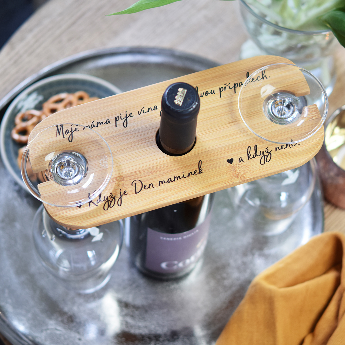 Pokud hledáte něco originálního a vtipného, pořiďte sobě nebo své mamince tento bambusový držák na sklenice a na víno.