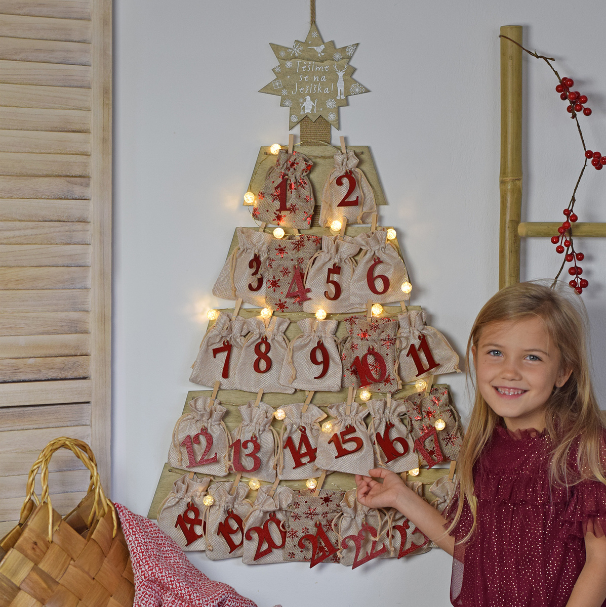 Kalendář se skládá z konstrukce ve tvaru vánočního stromečku, jutových pytlíčků a dřevěných čísel. Prohlédněte si naše další adventní kalendáře.