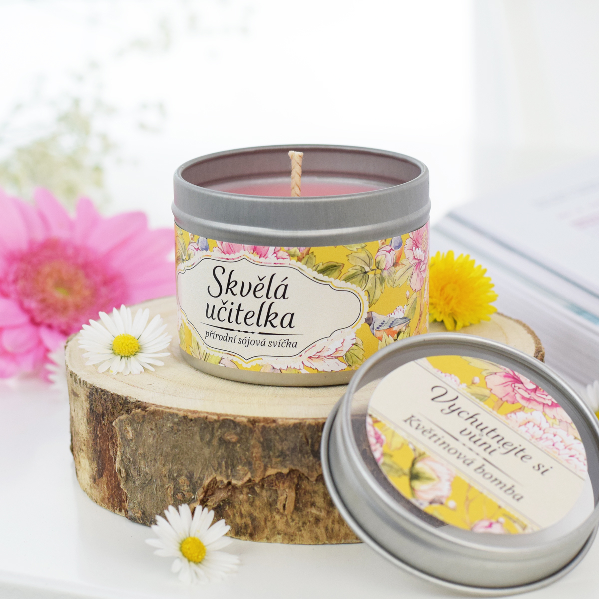 Přírodní svíčka ze sójového vosku s podmanivou vůní květin určená pro paní učitelky.