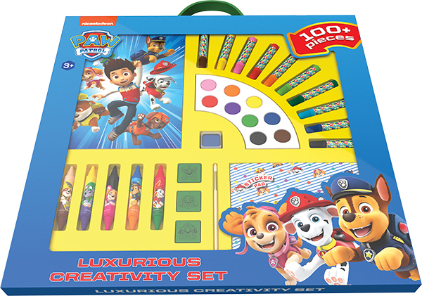 Kreativní kufřík obsahuje černobíle potištěný kufřík k vybarvení, 10 barevných fixů, 5 dvoubarevných pastelek, 2 gelové fixy, sešit s omalovánkami, sešit ke kreslení a list samolepek.
