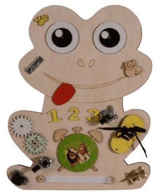 Tablica manipulacyja ŻABKA Wyposażenie: • ruchome kolorowe zębatki • kolorowe cyferki drewniane • rzep • zasuwki • but ze sznurówką (nauka sznurowania) • ruchome i obrotowe kółka do mebli • dzwonek rowerowy • zegar z ruchomymi wskazówkami • elementy ozdobne wymiary: 48, x 36,5 x 6,5 cm.