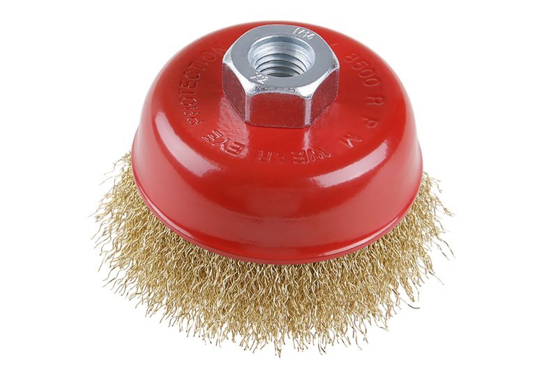Rotační kartáč - hrnkový, kartáče FESTA zaručují kvalitní použité materiály i zpracování, vlnitý drát - pomosazený 0,3mm, průměr 85mm, uchycení M14*2, počet drátů 1350, délka drátů 23mm, maximální otáčky za min. 12500, použití : pro odstranění rzi, barvy, leštění. Instruktážní video