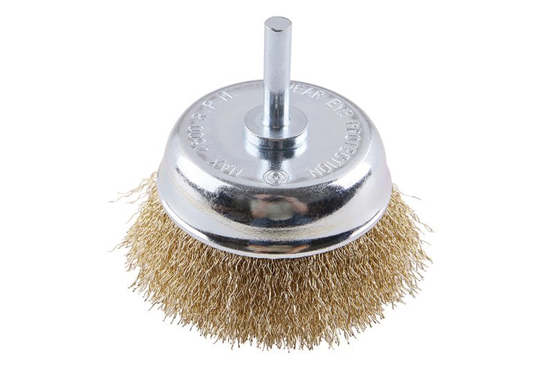 Rotační kartáč - hrnkový, provedení : vlnitý drát 0,25 mm - pomosazený, průměr 68 mm, stopka 6 x 27 mm, pozinkované tělo kartáče, počet drátů : 1728, délka drátu : 19 mm, max. přípustné otáčky : 4500 1/min, použití : pro leštění, zdrsňování, ostranění rzi a otřepů