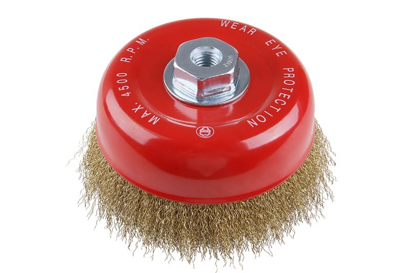 Rotační kartáč - hrnkový, kartáče FESTA zaručují kvalitní použité materiály i zpracování, vlnitý drát - pomosazený 0,3mm, průměr 150mm, uchycení M14*2, počet drátů 1350, délka drátů 23mm, maximální otáčky za min. 12500, použití : pro odstranění rzi, barvy, leštění Instruktážní video