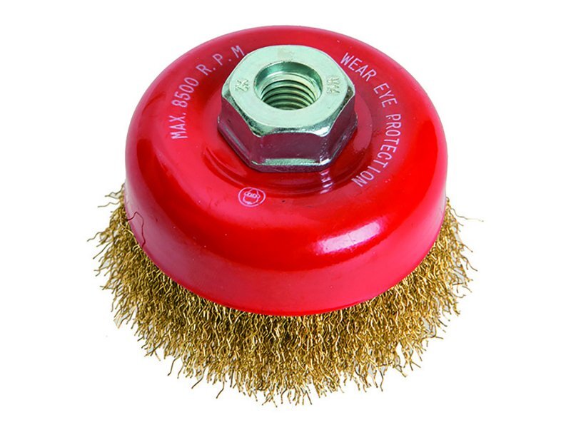 Kartáč miskový s mosaznými vlnitými drátky, uchycení M14, hrnkový, vhodné pro nerezové materiály. Instruktážní video