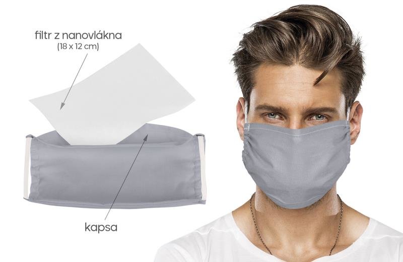 Ústní rouška s vloženým nanovlákenným filtrem - 1335/242 - světle šedá - 15x22cm