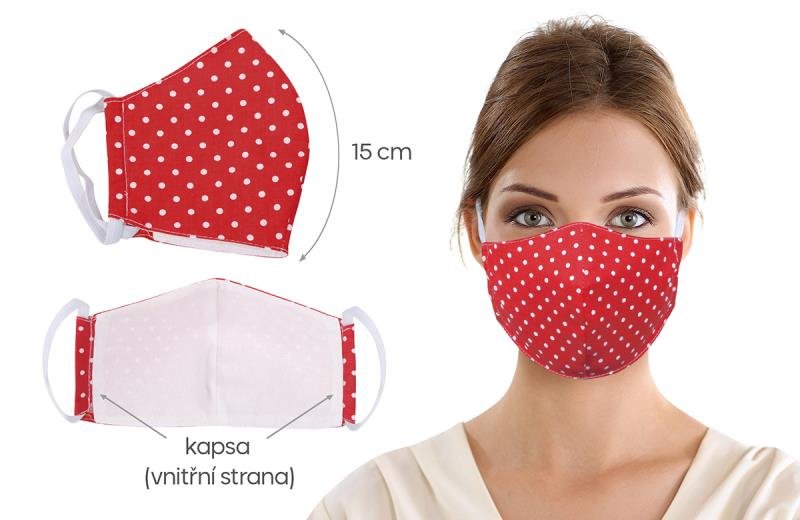 Ústní rouška bavlněná na gumičku s vnitřní kapsou - červený puntík - délka oblouku 15cm