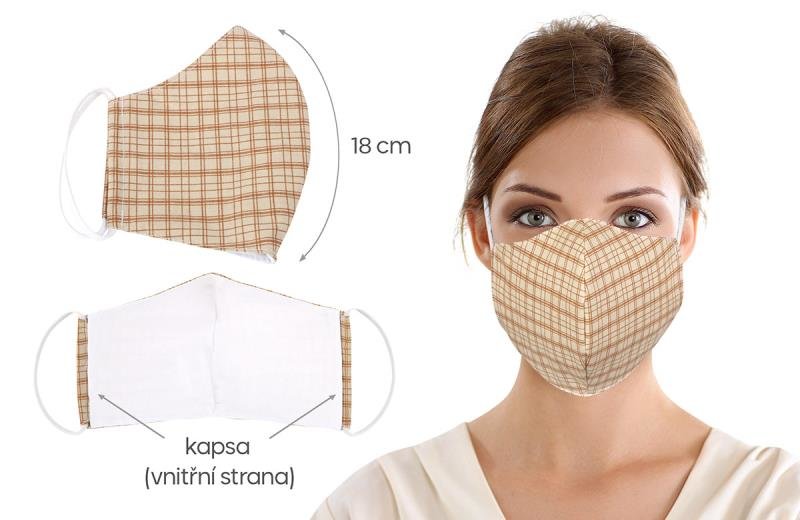 Ústní rouška bavlněná na gumičku s vnitřní kapsou - béžová mřížka - délka oblouku 18cm