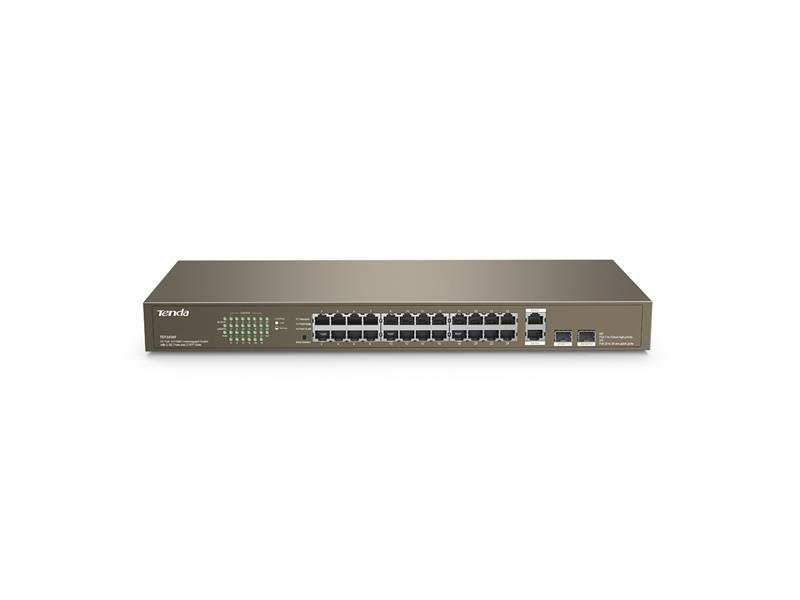 Tenda TEF1026F přepíná data pomocí 24 portů RJ45 a 2 Combo portů RJ45/SFP pro připojení uplinků, 24 portů 10/100 Mb/s RJ45 + 2x Combo RJ45/SFP (RJ45 rychlost 10/100/1000 Mb/s a SFP rychlost 1000Mb/s). Switch má ochranu proti přepětí 6kV. Podpora přepojování uzlů v módu Store-and-Forward. Full-duplex kontrola toku 802.3x, navíc podporuje energeticky úspornou normu 802.3z. Tenda TEF1026F je vhodná jak do menších a středních firem, tak i do větších domácností. Switch je možné nastavit do 3 různých módů provozu. Navíc je switch tichý, zcela bez ventilátorů, fanless. Tenda TEF1026F obsahuje přepínač pro výběr ze tří režimů: M1 Standart: V tomto módu pracuje jako klasický switch, veškeré porty mají auto-negaci, všechny porty spolu komunikují. M2 Port-based Priority: Port1 až Port8 mají vyšší prioritu než ostatní porty. Všechny porty spolu komunikují. M3 Port-based VLAN: V tomto módu jsou Port1 až Port24 izolovány samy od sebe, každý port Port1 až Port24 může komunikovat jen s uplink porty Port25 a Port26. Zabraňuje velkému šíření broadcastů a DHCP spoofingu. Tenda TEF1026F je kompatibilní se všemi SFP moduly o rychlosti 1000Mb/s které jsou Cisco kompatibilní. Ze značek můžeme doporučit SFP Signamax.