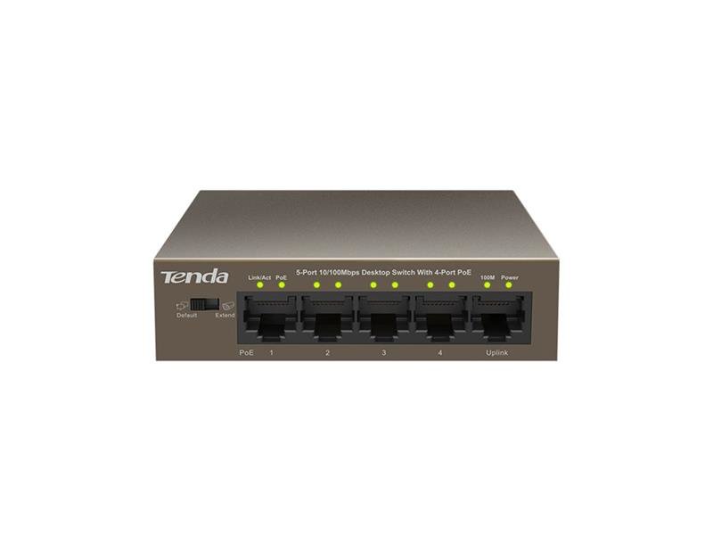 Tenda TEF1005P-4-38W přepíná data pomocí 5ti portů RJ45 s přenosovou rychlostí 10/100 Mb/s s automatickou detekcí rychlosti. Jeden port slouží pro Uplink a 4 PoE porty podporují PoE 802.3af. Switch podporuje stabilní 8 jádrové PoE napájení, ochrana proti přepětí 6kV. Podpora přepojování uzlů v módu Store-and-Forward. Full-duplex kontrola toku 802.3x, half-duplex kontrola toku v režimu Back-Pressure. TEF1105P-4-38W je vhodná jak do menších a středních firem, tak i do domácností. Přepínač Default/Extend modeTenda TEF1105P-4-38W obsahuje přepínač pro výběr dvou režimů: Default mode / Extend mode.