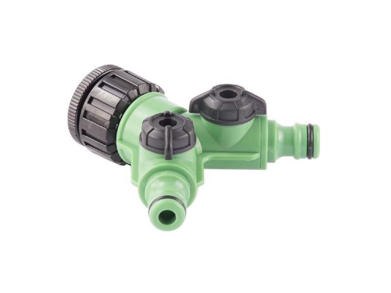 Plastový dvoucestný uzavírací ventil s rozdvojkou pro dvě rychlospojky. Umožňuje jak rozdvojení hadic, tak uzavření přívodu do obou částí.
